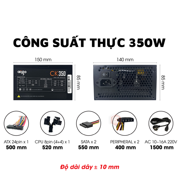 | Phụ kiện | 1. Vỏ hộp sản phẩm; 2. Bộ nguồn Aigo CK350; 3. Dây nguồn AC 110~240V/10~16A – 1.5m 4. Hướng dẫn sử dụng. |